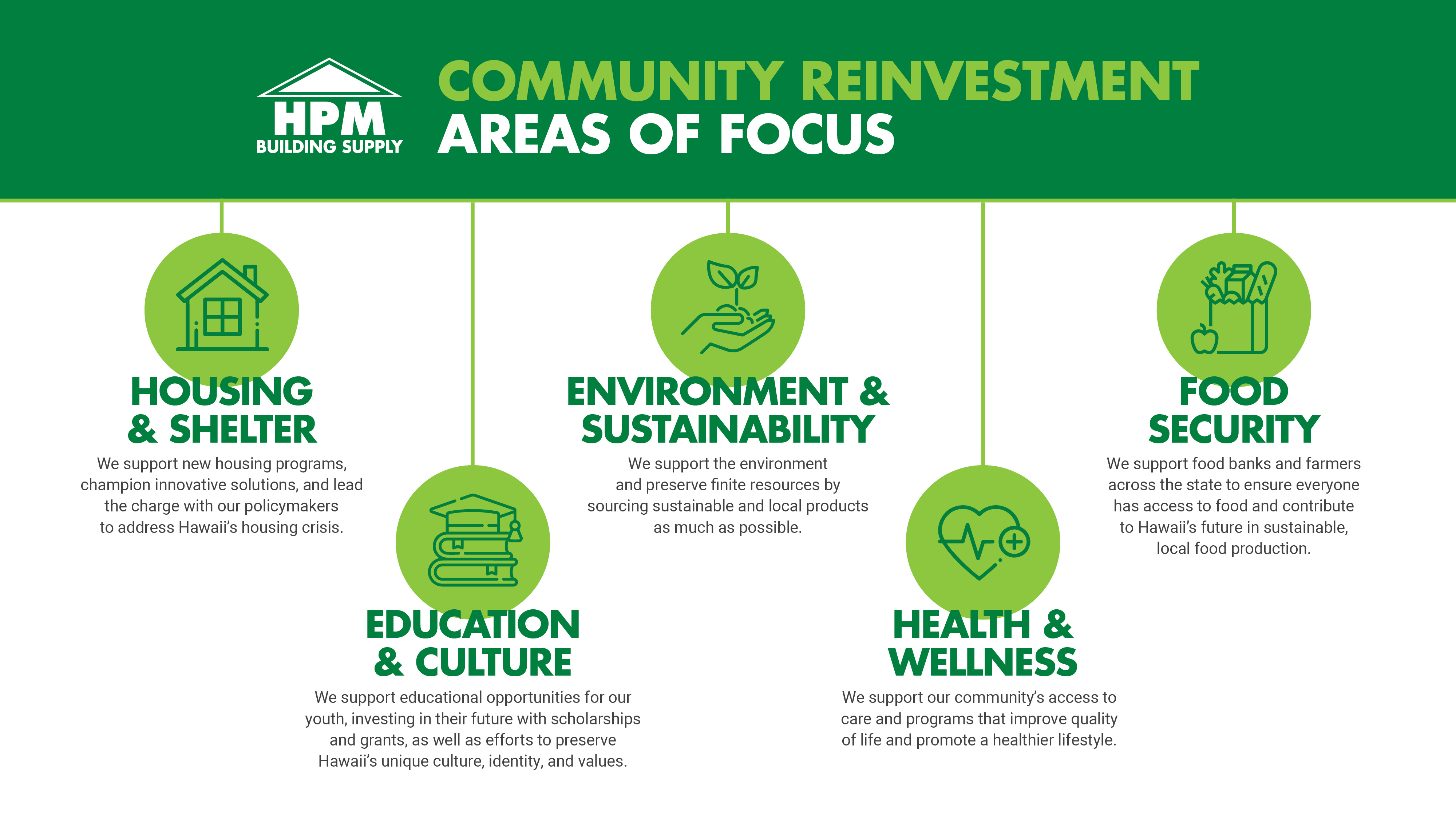 The Community Reinvestment Framework (“CRF”) is a philosophy and guiding mindset for all we do at HPM, from doing business with our customers, to how we interact with our owner-employees. The framework was developed with the company’s Mission statement in mind. The name Community Reinvestment is to reflect the community’s support for HPM and our commitment to continue giving back. The CRF branches out into 5 focus areas that play a critical role in one’s everyday life.